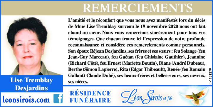 Les funérailles de Mme Lise Tremblay ont eu lieu le samedi 10 juillet à 13 h en l’église de Ste-Paule et l’inhumation au cimetière de Ste-Paule.