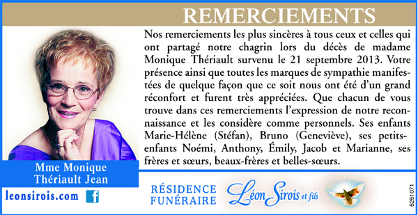 À Rimouski, le 21 septembre 2013, est décédée accidentellement à l'âge de 68 ans et 2 mois, madame Monique Thériault épouse de feu monsieur Yvon Jean. Elle demeurait à Rimouski et autrefois à Matane.