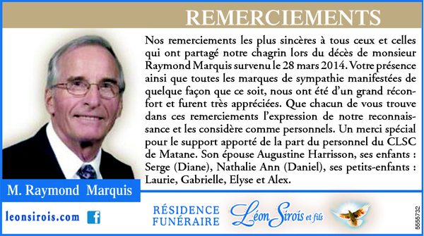 Au Centre hospitalier de Matane, le 28 mars 2014, est décédé à l'âge de 83 ans, monsieur Raymond Marquis époux de madame Augustine Harrisson. Il demeurait à Matane.