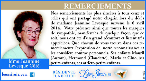 Au Centre hospitalier de Matane, le 6 avril 2014, est décédée à l'âge de 82 ans et 8 mois, madame Jeannine Lévesque épouse de feu monsieur Valmont Côté. Elle demeurait à St-Luc-de-Matane.