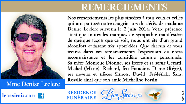 Au Centre hospitalier de Matane, le 2 juin 2014, est décédée à l'âge de 60 ans et 3 mois, madame Denise Leclerc fille de madame Monique Dionne et de feu monsieur Charles-Édouard Leclerc. Elle demeurait à Matane.