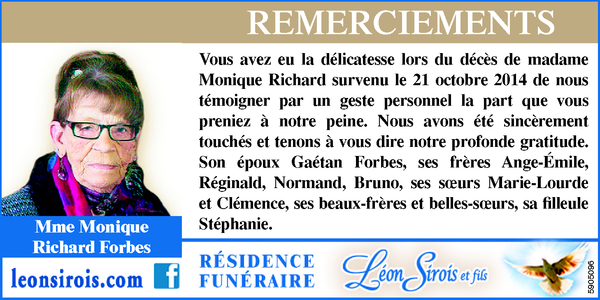 Au Centre hospitalier de Matane, le 21 octobre 2014, est décédée madame Monique Richard épouse de monsieur Gaétan Forbes. Elle demeurait à Matane.