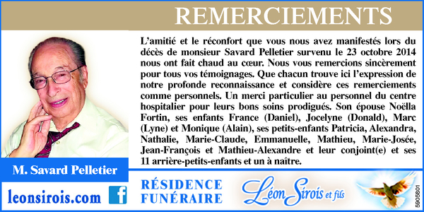Au Centre hospitalier de Matane, le 23 octobre 2014, est décédé à l'âge de 86 ans et 5 mois, monsieur Savard Pelletier époux de madame Noëlla Fortin. Il demeurait à Matane.