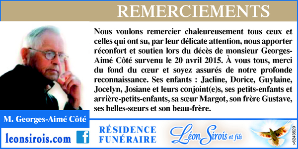 Au Centre hospitalier de Matane, le 20 avril 2015, est décédé à l'âge de 91 ans et 7 mois, monsieur Georges-Aimé Côté époux de feu madame Cécile Thibault. Il demeurait à Matane.